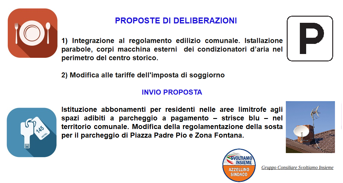 Abbiamo depositato, nella giornata di ieri, due proposte di deliberazione da sottoporre al Consiglio Comunale e una proposta di modifica delle aree adibite a parcheggio a pagamento con l'introduzione di abbonamenti mensili e stagionali per i residenti.